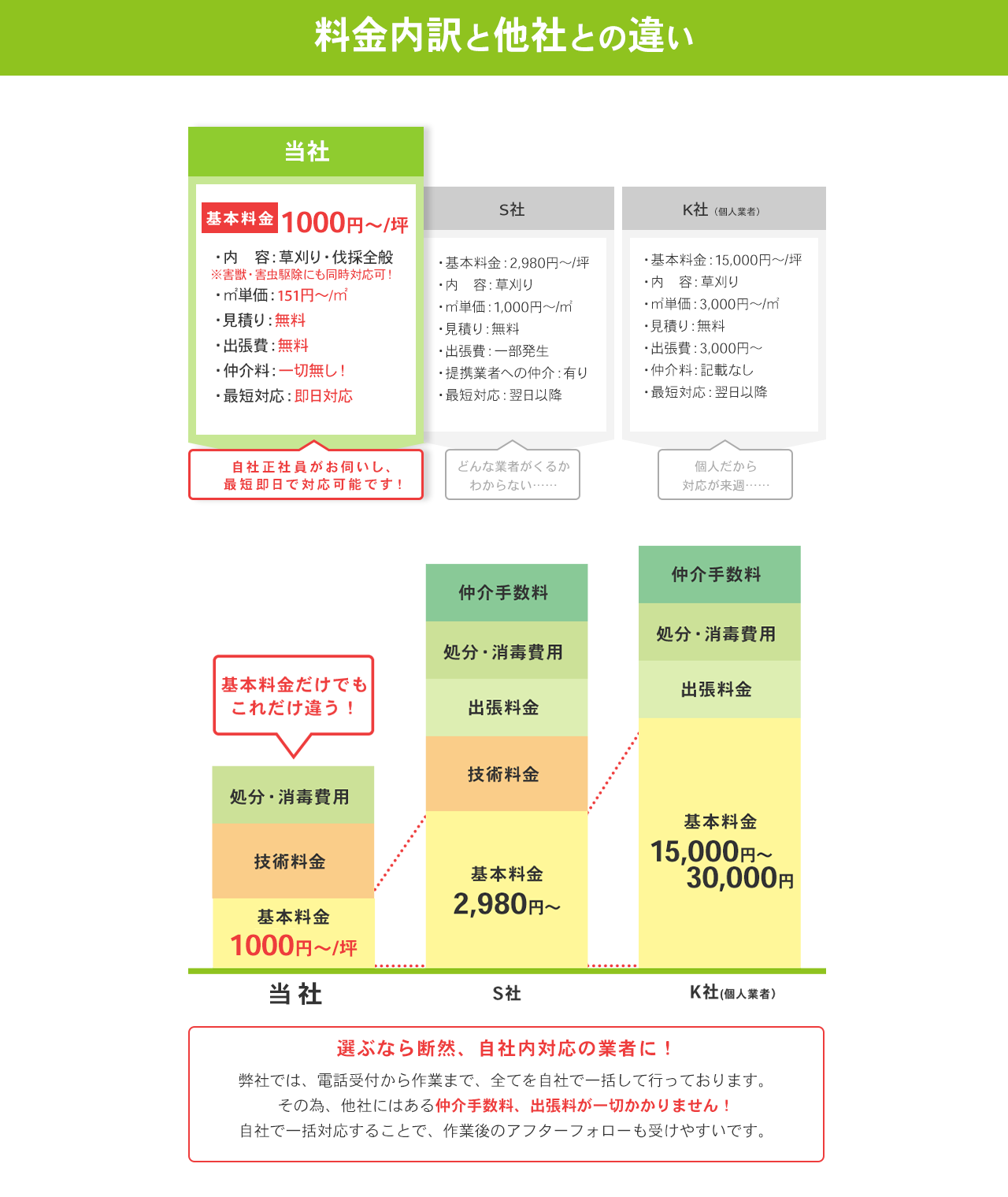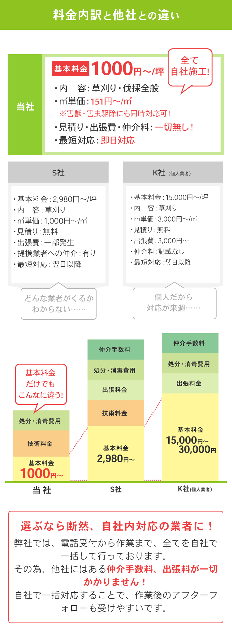 当社では受付から完了まですべて自社の作業員が担当します。仲介を介さないのでリーズナブルな料金と迅速な対応が可能です。